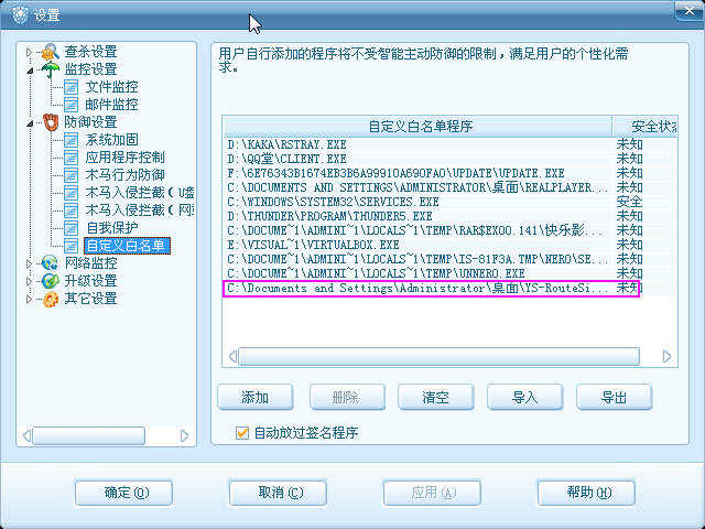 我是说 我的某一个程序被报病毒,想自己添加进白名单,以使它运行,还有我并没有指责瑞星什么的,我都标了是使用交流,以为这个白名单可以达到添加该程序进白名单,不受瑞星防御监控影响,是我使用理解上有偏差。