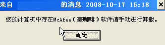 msg %username% 您的计算机中存在McAfee(麦咖啡)软件请手动进行卸载。