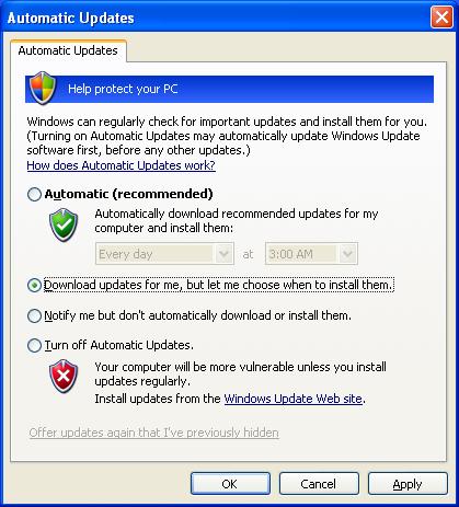 永远也不要打开自动更新,要更新系统打补丁可以通过第三方软件进行,如:瑞星卡卡或金山清理专家.我的自动更新从来都没开过,:default6: 为了安全 呵呵:default6: