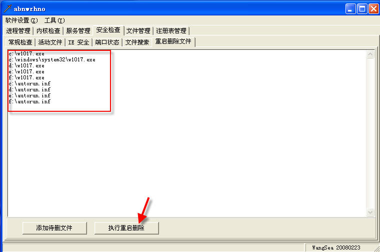 4、在使用windows清理助手得时候,已经查到病毒w1017.exe但是无法彻底删除。