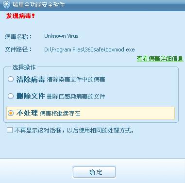 Unknown Virus 不处理 2008-10-20 15:22:43 手动查杀 D:\Program Files\360safe boxmod.exe 本地服务器
