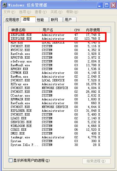 关闭多余的网页使任务栏只剩1个,如果两个IE进程变一个了,那就表示正常。