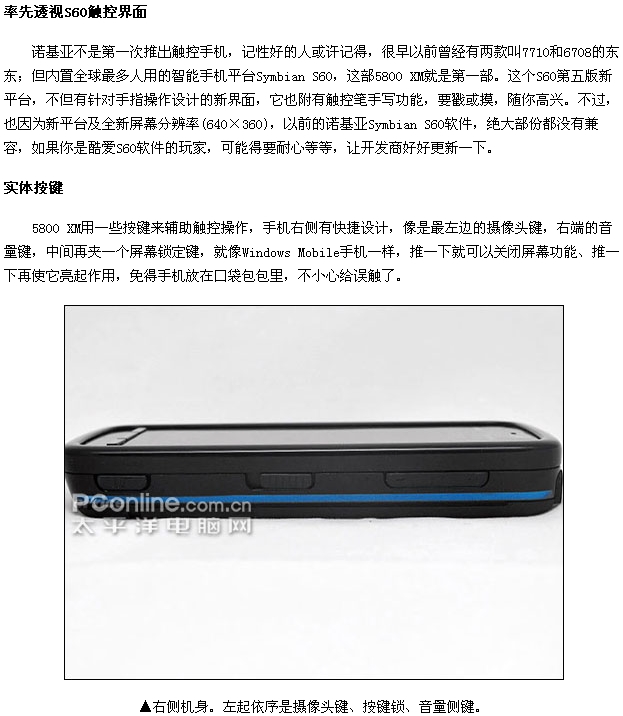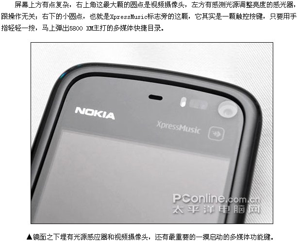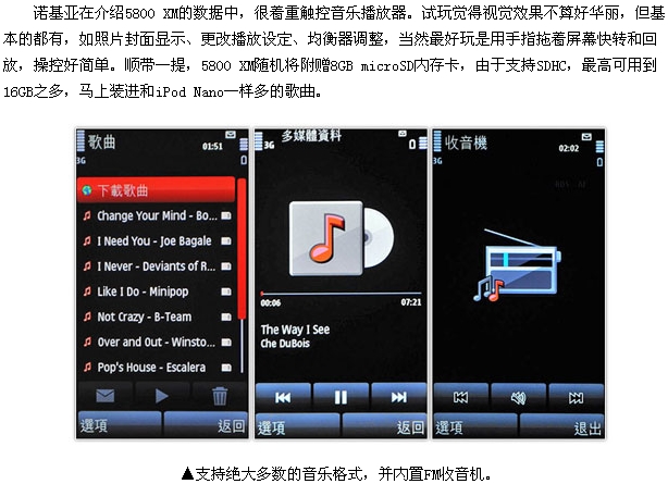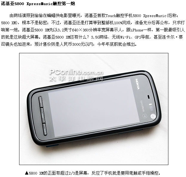 诺基亚首部S60触控智能手机诺基亚5800 XpressMusic终于发布了!5800 XM出乎意料走大众路线,3.2英寸高清晰触控屏幕、蔡司镜头、3.5G网络、GPS导航、Wi-Fi统统到齐,音乐扩展功能更是一流。5800 XM年底前上市,今日就拿真机出来让大家先睹为快!