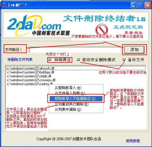 从剪贴板导入不检查路径,导入后在要删除文件上点击右键,选择立刻重启删除,电脑会重启进入DOS界面进行删除操作。运行xdelbox前最好卸载所有可移动存储介质(包括U盘,MP3,手机存储卡等)。