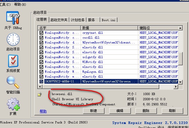2.删除重启后使用SREng修复下面各项: 启动项目 -- 注册表之如下项删除: