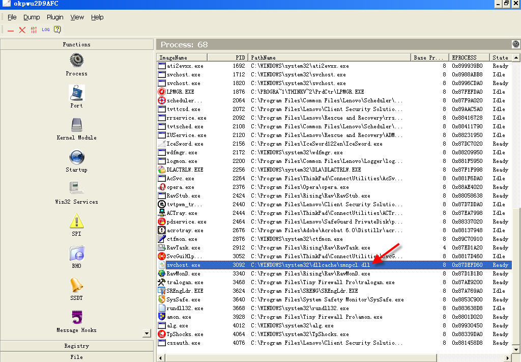 2、结束病毒进程svchost.exe(dll图标,路径:C:\windows\system32\dllcache\smncpl.dll。见图2)。结束IE浏览器进程。