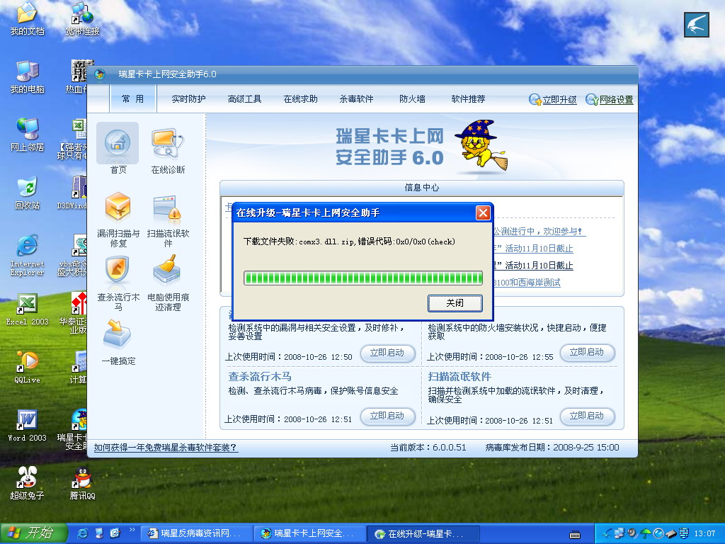 打开“我的电脑”--C盘--Program fills--Rising--AntiSpyware--Update--把里面的文件全部删除了--再升级.