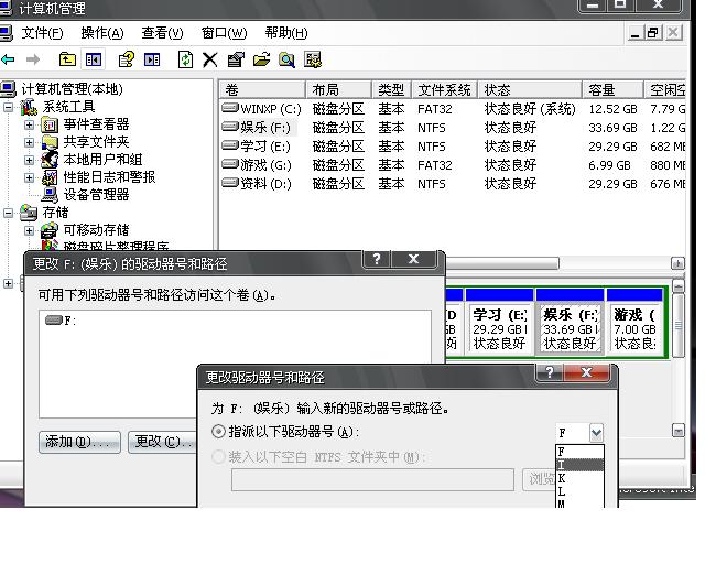 “我的电脑”-“控制面板”-“管理工具”-“计算机管理”中,我们单击左边树图中看到“磁盘管理”,这时在右边会列出系统当前的磁盘分区,比如要修改J盘,选择J盘,单击鼠标右键,在弹出的菜单中选择“更改驱动器号和路径”,这时,在打开的“更改J 的驱动器号和路径”对话框中单击“更改”按钮,可以指定一个盘符,如果你需要和其他的盘符调换的话,你可以先选择一个后面的一个盘符当作临时的,然后再两两调换