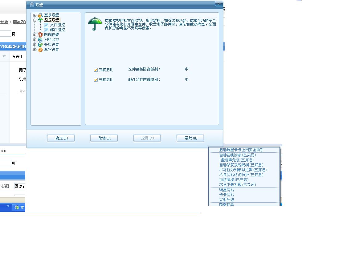 因为这两款软件的功能互补,建议同时开启两个软件的监控。但是可能由于内存较小,同时开启影响系统速度,可以考虑关闭卡卡的监控。