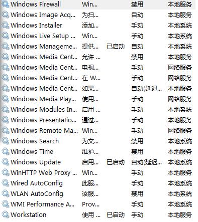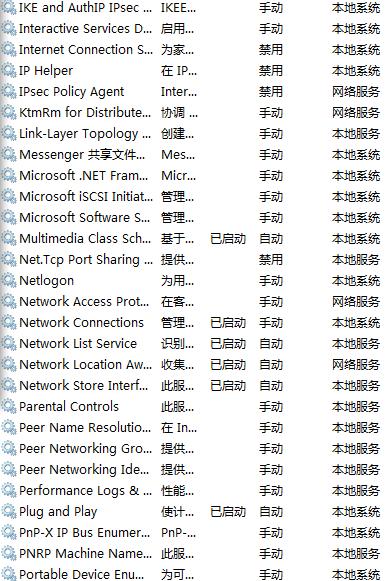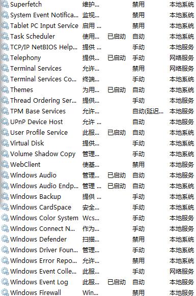 为了方便你们诊断,我把我的系统所开的服务列出来,因为优化过,所以禁用过一些服务,也不知道是否和这个有关。