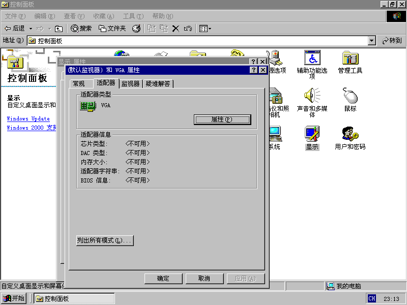 2000系统下找不到这个界面,其实你也可以直接到下载的解压万能显卡驱动,逐个显卡驱动安装,看看那个显卡驱动能安装,虽然方法比较笨,但应该是一种能安装显卡驱动的方法。