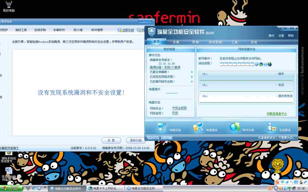 问题现象:瑞星全功能软件2009 漏洞扫描发现系统一个,用卡卡6.0 修复之后重新扫描还是显示漏洞