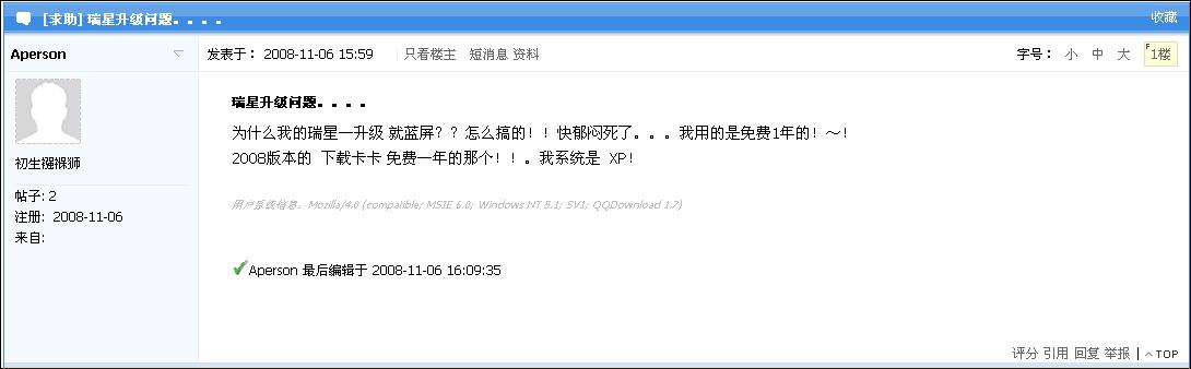 为什么我的瑞星一升级 就蓝屏??怎么搞的!!快郁闷死了。。。我用的是免费1年的!~!