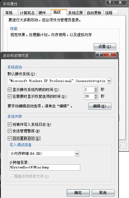 方法:右击桌面“我的电脑”——属性——高级——启动和故障恢复,点击设置——在弹出“启动和故障恢复”对话框的写入调试信息,选择为“小内存传储(64KB)”——确定。那么下次出现蓝屏后,会在C:\windows\minidump中记录有该文件。设置看下面截图