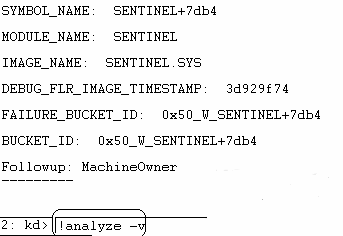 5,打开Dump文件后,屏幕会出现windows的Debug窗口,在窗口的底部会出现命令行,输入 ‘!analyze -v’命令即可开始蓝屏的分析,剩下来的工作就是等这个工具给你一个满意的答案:某个驱动文件引起的蓝屏。