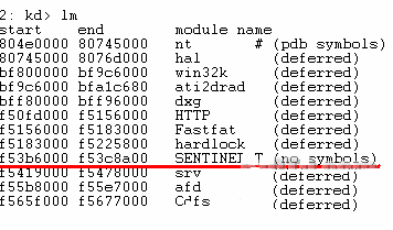 你还可以验证这个驱动程序是不是在机器的的内存中,键入‘lm’就可以列出所有驻留在内存中的程序;