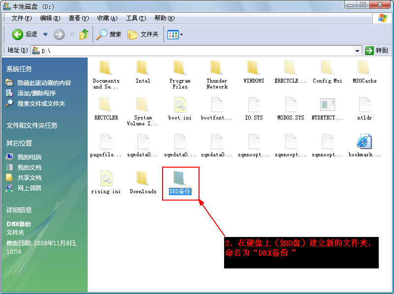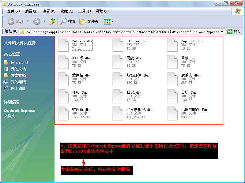 第四步:把该目录下所有的文件复制到之前新建的文件夹中(D:\ DBX备份)。然后关闭Outlook Express--删除这些文件。