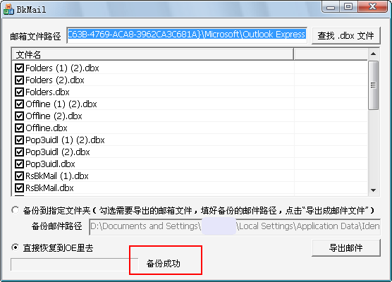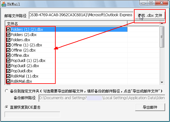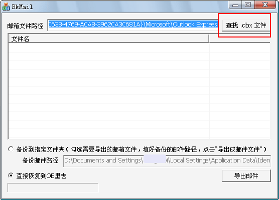 第六步:运行邮件恢复工具BkMail.exe。工具会自动读取默认的邮件存储目录,请您点击“查找.DBX文件”按钮。(如果您在安装Outlook Express的时候改变过安装路径,请在“邮箱文件路径”处填入相应路径)