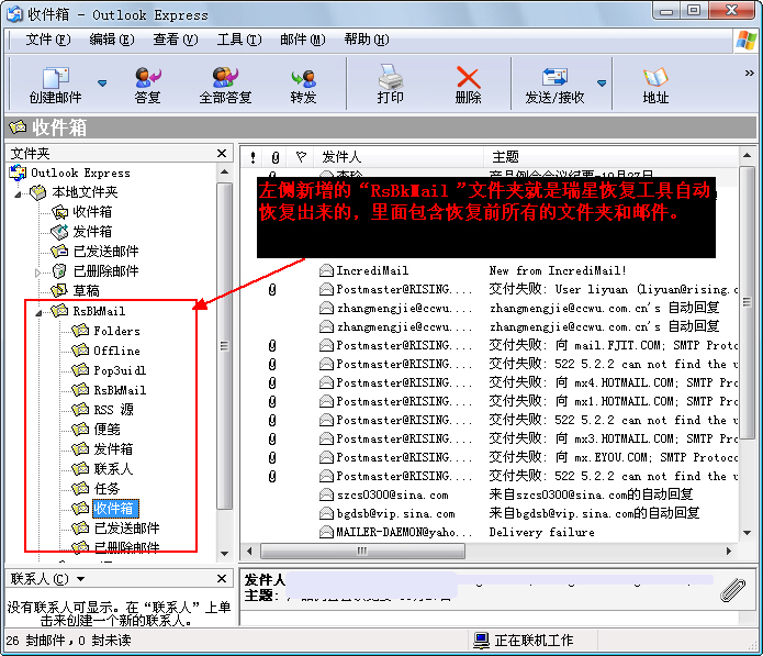 10、邮件备份成功后,打开Outlook Express,在左侧会看到新增的一个文件夹“RsBkMail”,这就是瑞星恢复工具恢复后自动生成的。里面包括选择恢复的所有项目和邮件。