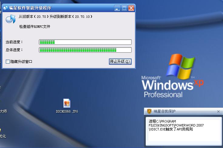 电脑并没有安装金山毒霸,近期来一直升级正常。昨天买了一套金山词霸2007专业版,安装了以后就出怪事了,升级中提示“已经安装金山毒霸,可能冲突”,我纳闷,没装金山毒霸啊!点一下提示中的“卸载”按钮,立即提示金山词霸文件触动了api事件!晕,看来是瑞星误认金山词霸为金山毒霸了!希望瑞星能改进一下,准确一点!