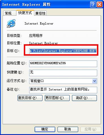 打开“C:\Documents and Settings\Administrator\「开始」菜单\程序”这个文件夹,右键“Internet Explorer”这个快捷方式图标,选择“属性”,然后看看下图处反白显示的地方,有没有异常,正常情况下应该是"C:\Program Files\Internet Explorer\IEXPLORE.EXE",如果你的这个字符串后面有多余的尾巴,删除之……