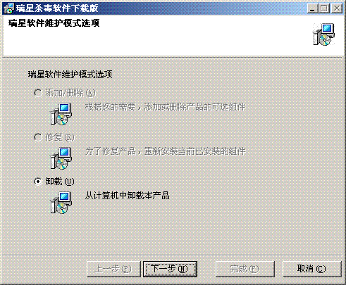 .如果点开始/程序/瑞星杀毒软件/添加删除组件后,打开的界面修复选项是灰色的,那就是软件异常的,卸载瑞星,卸载时选择删除安装目录,然后重新安装就可以了。