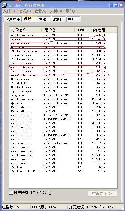 划红线的都可疑,估计后台还有,抓日志吧。还有进安全模式看能杀毒不??