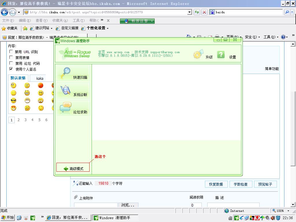 2份日志/报告以附件上传(点击我回的贴的右下角的“引用”,然后就应该知道怎么以附件发了),贴到反病毒/反流氓软件论坛.已发帖请跟贴,勿另开新帖。如以上工具不能打开或正常运行,短消息call我