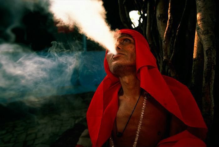 印度孟买,寺庙外菩提树下正在抽烟的苦行僧