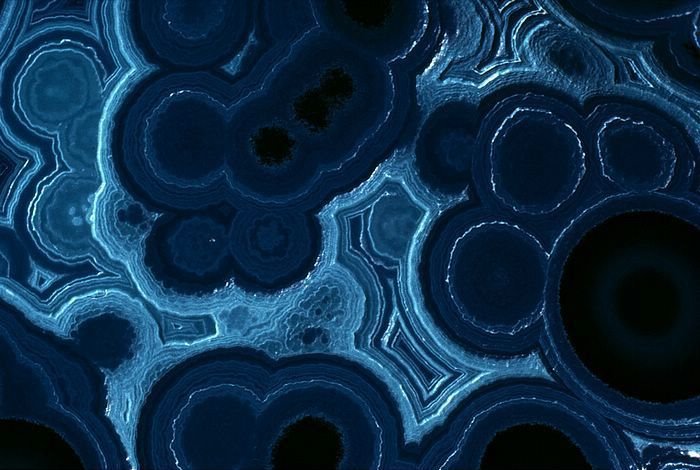 蓝铜矿,在显微镜下呈现复杂的蓝色图案