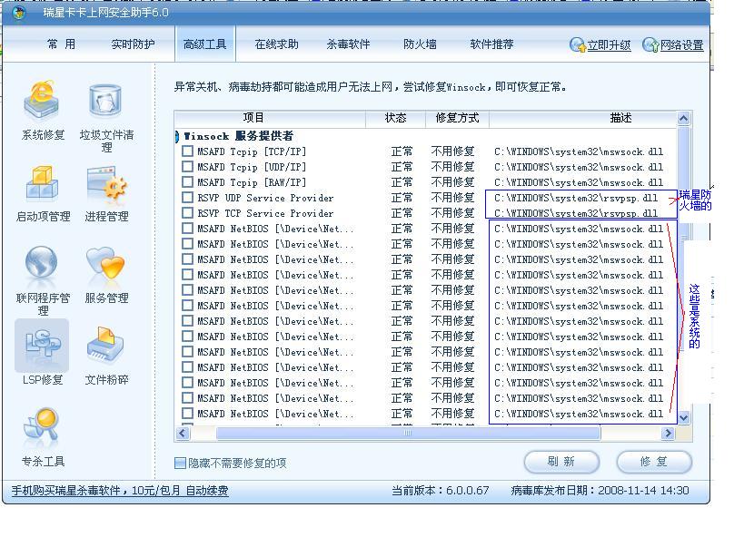 什么是LSP?),当杀毒软件把病毒或者木马清除之后,被劫持的LSP并没有被恢复,所以需要用到瑞星卡卡安全助手高级工具的[LSP修复]功能。
