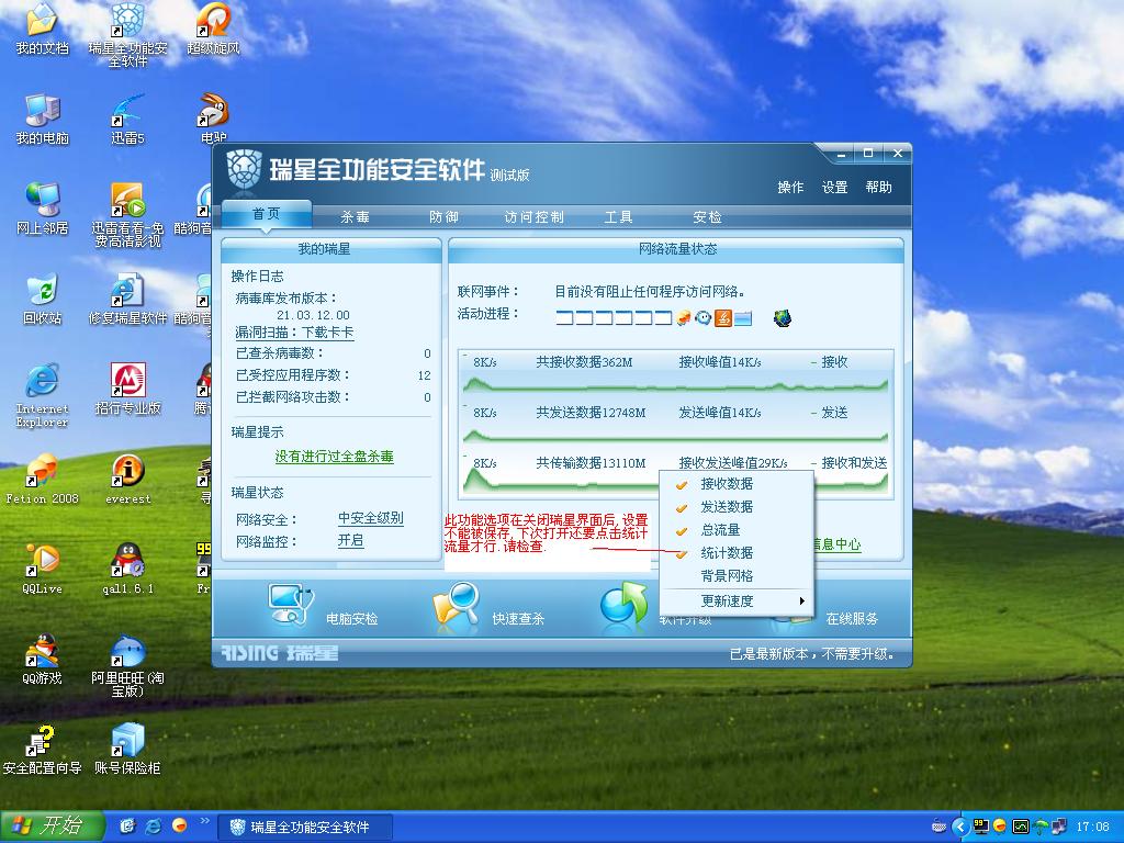 我参于了瑞星2009版的测试,在使用中发现网络流量统计功能设置不能被保存,比如我在统计数据前面打了勾,可以当我下次打开瑞星的时候,这选项又要重复操作,详见附件,请帮忙解决,还是就是想提出一个人人见意,能不能把流量统计功能做的更强,比如说可以显示每个端口的流量统计,和访问网站的区域定位显示,,方便用户,谢谢,永远支持你们..