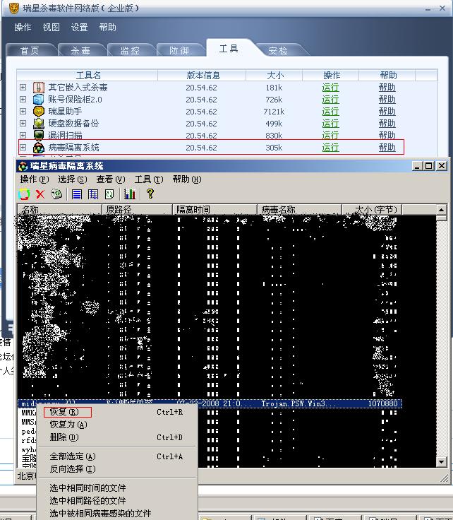 瑞星病毒隔离系统中的信息,是清除的病毒信息,将其还原后,肯定还是病毒文件,建议将瑞星监控关闭后再还原。