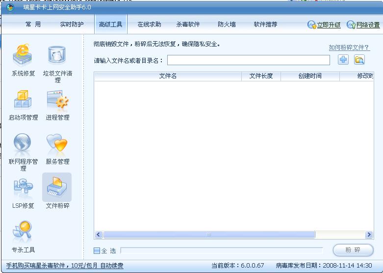 当遇到有卡卡助手或者是杀毒软件杀不掉的程序或者是文件时,可以尝试使用瑞星卡卡安全助手的文件粉碎功能粉碎: