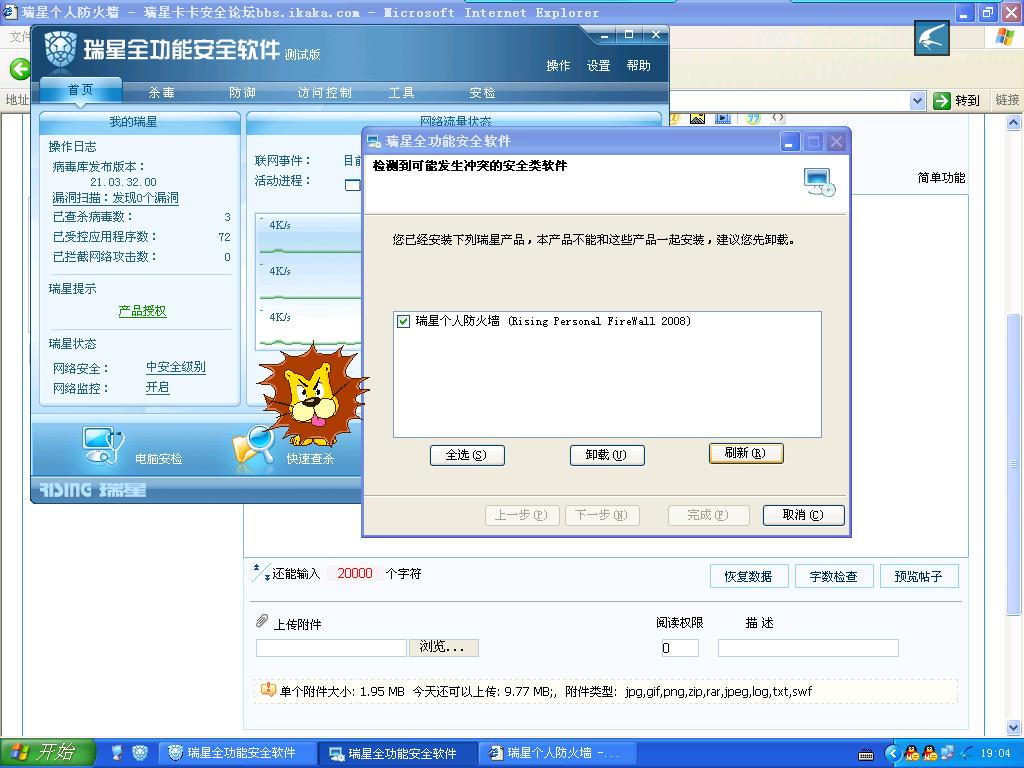 哦,我给瑞星升级时出现的,即然这样,怪不得防火墙启动不了呢,得把它卸了