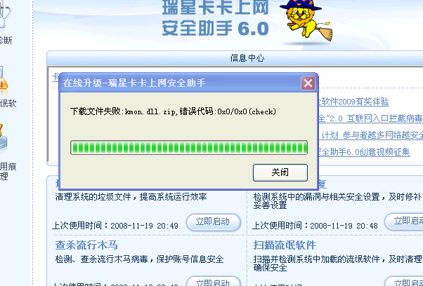 如果还不行:卸载卡卡上网安全助手,重启计算机,删除卡卡安装目录的文件,登录瑞星网站重新下载最新版卡卡上网安全助手,安装并升级至最新版。