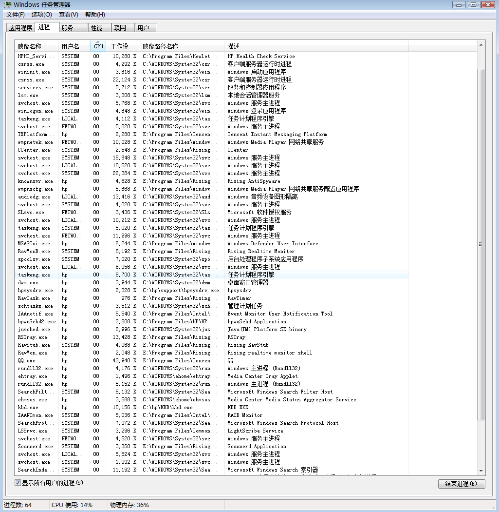 任何操作系统的任务管理器打开后,首先都是无序的,如果希望按照字母排列,可点击映像名称即可。