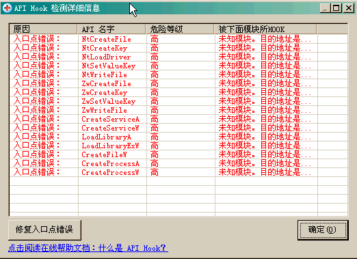 API HOOK一般来说是系统功能被其它程序拦截了,有可能是病毒,也有可能是防病毒软件,因为他要拦截系统调用对文件进行扫描和行为判断。
