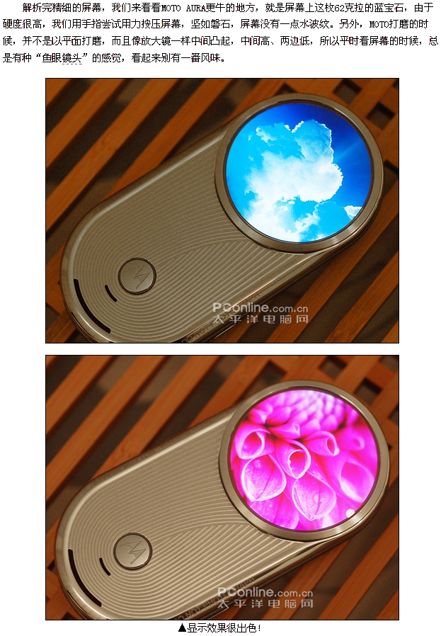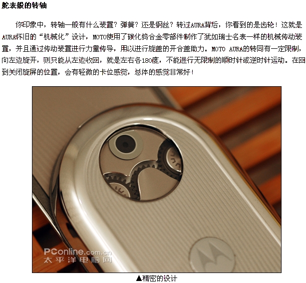 AURA的到来,让我们相信,MOTO依旧是一位巨人,他只是在调整自己的步伐。圆形1600万色显示屏、300dpi的超高清晰分辨率、62克拉一级蓝宝石水晶屏幕镜面,200多个零部件组成转轴,这些参数似乎盖过了
