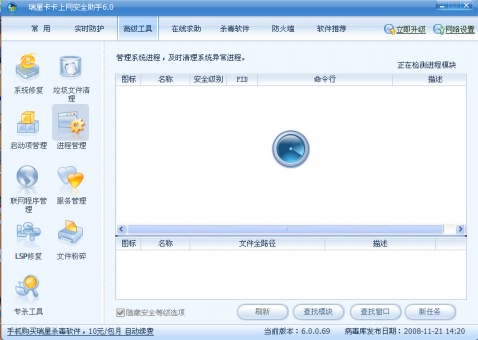 扫描进度条的问题 卡卡最基本的功能还是建立在扫描与清除的基础上,一直以来这个界面都是以进度条的方式和大家见面。根据GUI的设计原理,这体现了人性化,用来反映一个过程需要的处理时间,以帮助用户缓解等待的急躁心理。新版中使用了漂亮的旋转图标(如下图)代替了进度条。视觉效果是不错,但是缺乏了直观性。在整个扫描过程中一直旋转的图标无法反应整个操作的进度,特别是对于像扫描和清除系统垃圾这样的操作一般是需要相对长的时间,旋转的图标会使用户的在等待的过程中产生不耐烦的感觉,进而选择放弃,这样就有违了我们设计的初衷。希望可以采取进度条与旋转图标两者结合的方式。在技术上这点是不难实现的,而且提高了界面设计的质量。