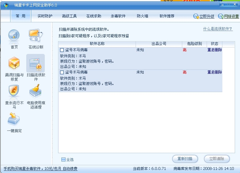 用瑞星查杀 和查杀流行木马都未显示有木马 高手支个招
