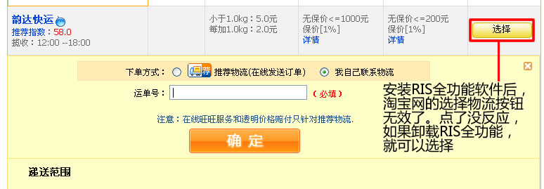 涉及的其它软件版本:只要安装RIS全功能软件,淘宝就无法选择发货物流。
