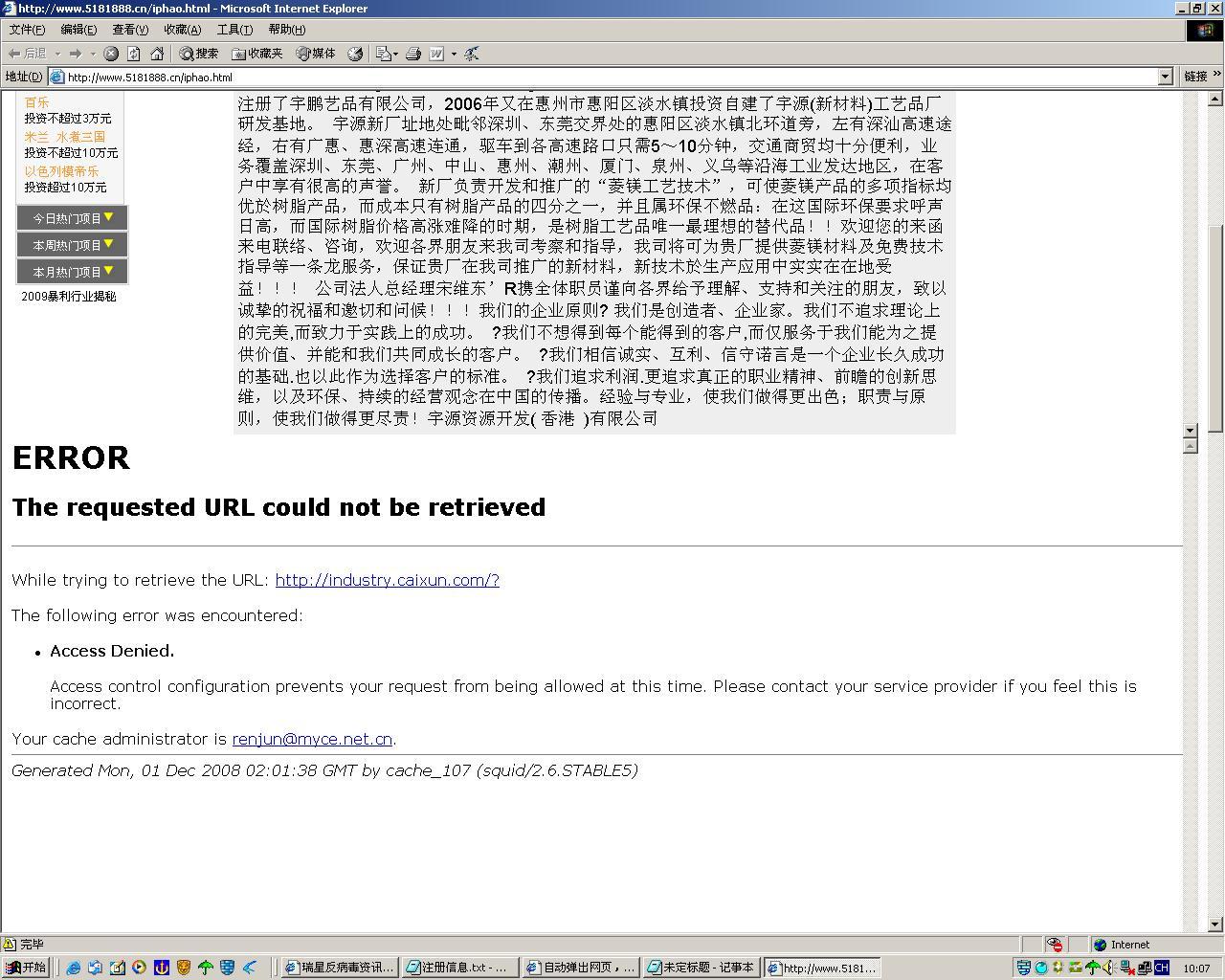 每隔10秒左右就会弹出一个网页,然后迅速隐藏后台,只能在任务管理器里看见一个IE进程iexplore.exe 慢慢的机器就卡死掉了 每弹一次桌面上还弹出一个淘宝警告。