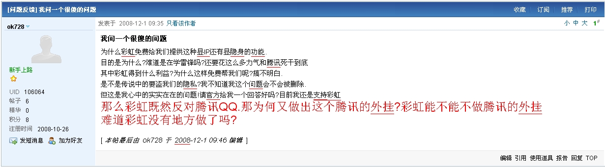 :default4: 彩虹QQ卑鄙下流无耻,和腾讯斗不是为了炒作吗,恶心死了,窥探隐私,还振振有词的反驳腾讯:说腾讯剥夺了用户的选择权,那么我倒想问他们了,他们有给那些隐身用户隐私权了吗?恶心死了:default12: :default12: