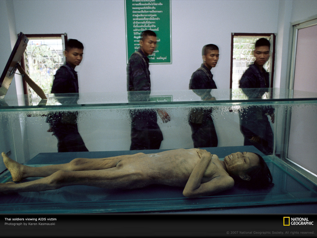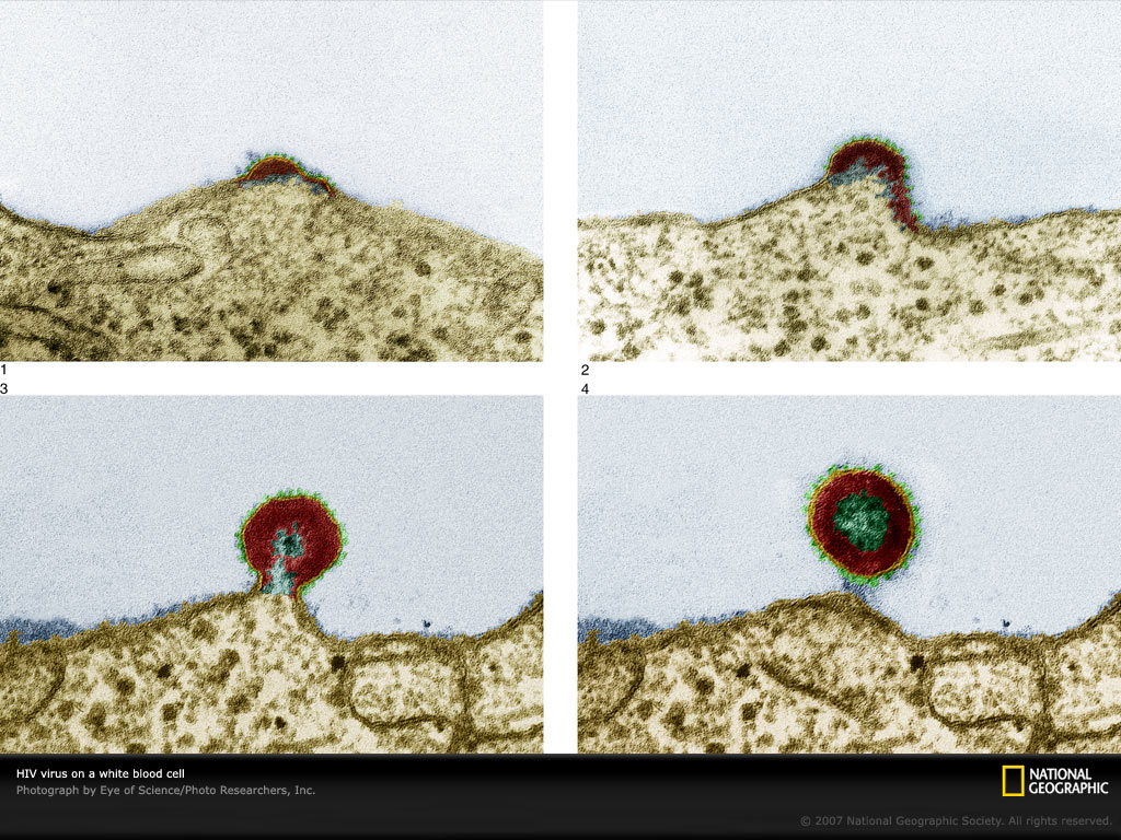 A colored transmission electron micrograph image captures the HIV virus budding from the surface of a T-lymphocyte white blood cell. The virus particles attack T-lymphocytes, stealing their genetic machinery, thereby forcing them to produce more copies of the virus. The new virus particles then erupt from the cell to infect other T-lymphocytes. As these are a vital part of the immune system, the disease severely weakens immunity, making victims susceptible to seemingly harmless infections.