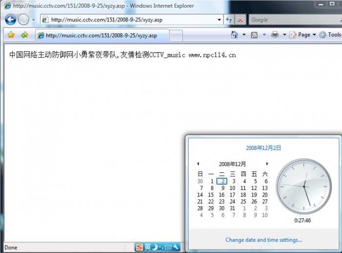 胆子不小啊,挂马到是没什么,居然敢修改CCTV的网页而且还留名,这个黑客是不是脑袋进水了?只要这黑客还在中国,等着坐牢吧!