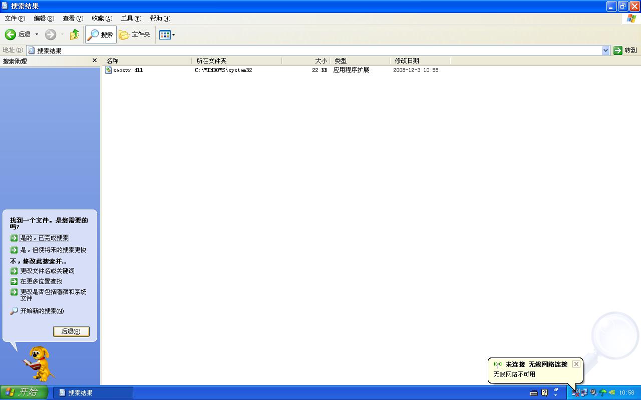 1、重装XP系统(光盘引导,格盘重装),未安装任何软件包括驱动,能搜索到secsvr.dll。安装瑞星后查这个文件,显示病毒。