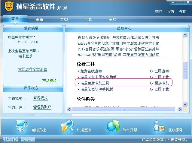 瑞星的专杀工具栏里面不是有的。。但是需要检查更新过以后才能使用。。我的意思是建议不需要检查更新就可以使用、、还有更新可以归类到即使升级里面。。实现全部自动更新。。