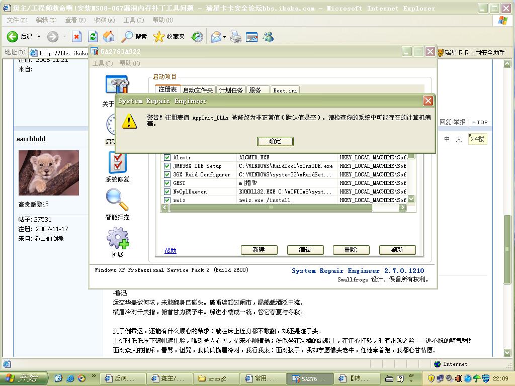 2份日志/报告以附件上传(点击我回的贴的右下角的“引用”,然后就应该知道怎么以附件发了),贴到反病毒/反流氓软件论坛.如已发帖的请跟贴,勿另开新帖。建议2份日志同时上传,起到互补的作用(原因:金山和SRENG都能扫出另一个不能扫出的内容)!!
