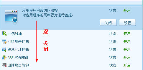 请您尝试逐一禁用“应用程序网络访问监控”、“IP包过滤”、“网络攻击拦截”、“恶意网址拦截”、“ARP欺骗防御”、“出站攻击防御”